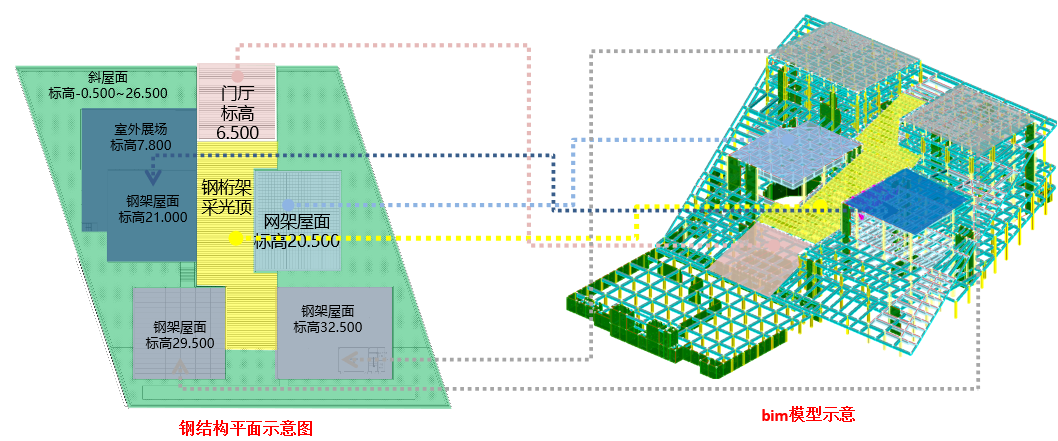 該項目主體采用現(xiàn)澆鋼筋混凝土框架-剪力墻結(jié)構(gòu)體系,局部主體為鋼結(jié)構(gòu)。其中,地下勁性鋼柱、地上勁性鋼柱、鋼骨梁、展廳區(qū)域為大跨度鋼結(jié)構(gòu);樓蓋、采光頂為方管桁架、入口門廳為圓管柱及箱型鋼梁支撐體系;屋頂為鋼架,天象廳屋蓋為焊接球網(wǎng)架結(jié)構(gòu),鋼構(gòu)件形式多樣。項目的安裝方式為塔吊安裝,將充分證實公司的綜合能力。