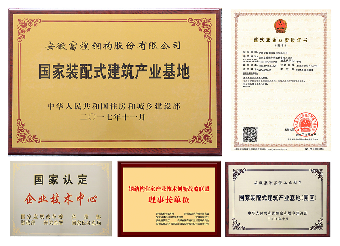 作為安徽進軍建筑產(chǎn)業(yè)化的先鋒企業(yè),富煌鋼構(gòu)早在2008年就被認定為“國家高新技術(shù)企業(yè)”;2014年獲批“國家認定企業(yè)技術(shù)中心”;2016年取得“安徽省建筑產(chǎn)業(yè)現(xiàn)代化示范基地”稱號;2017年3月榮獲“建筑工程施工總承包特級”資質(zhì);2017年11月被住建部評為首批“國家裝配式建筑產(chǎn)業(yè)基地”;2018年當(dāng)選“國家裝配式鋼結(jié)構(gòu)建筑技術(shù)創(chuàng)新聯(lián)盟”理事長單位;2020年入選“安徽省首批省級裝配式建筑產(chǎn)業(yè)基地”稱號、牽頭編制的《合肥市裝配式建筑應(yīng)用技術(shù)系列手冊》正式發(fā)布、所在的富煌工業(yè)園被住建部認定為“國家裝配式建筑產(chǎn)業(yè)基地(園區(qū))”。