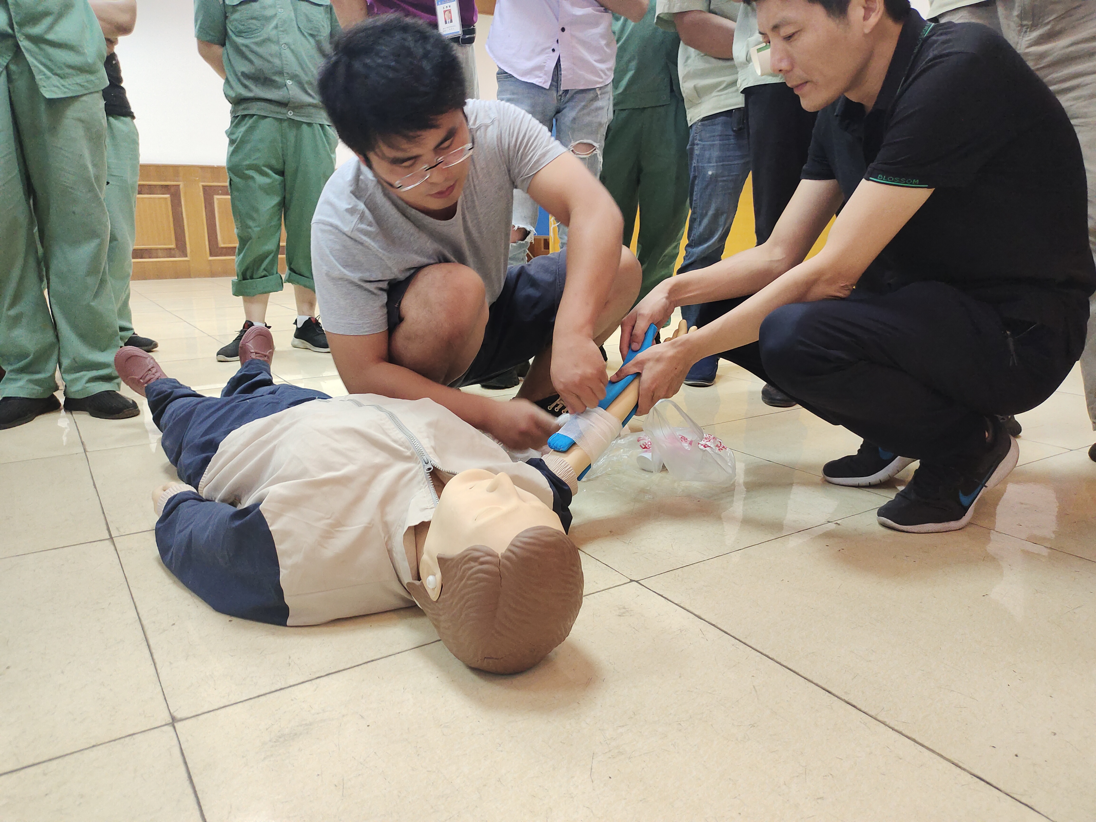 培訓(xùn)中,主任王欣以生動(dòng)的語言、真實(shí)的案例,結(jié)合日常生活和工作,分別就急救重要性、基礎(chǔ)知識(shí)、心肺復(fù)蘇、傷口包扎處理進(jìn)行了講解。同時(shí),手足外科醫(yī)生茆文龍利用教學(xué)模具,現(xiàn)場(chǎng)指導(dǎo)員工進(jìn)行心肺復(fù)蘇、骨折傷者現(xiàn)場(chǎng)定位保護(hù)、傷口包扎實(shí)操培訓(xùn),較好地豐富了員工的急救知識(shí),提升了大家對(duì)意外傷害的預(yù)防和處理能力。