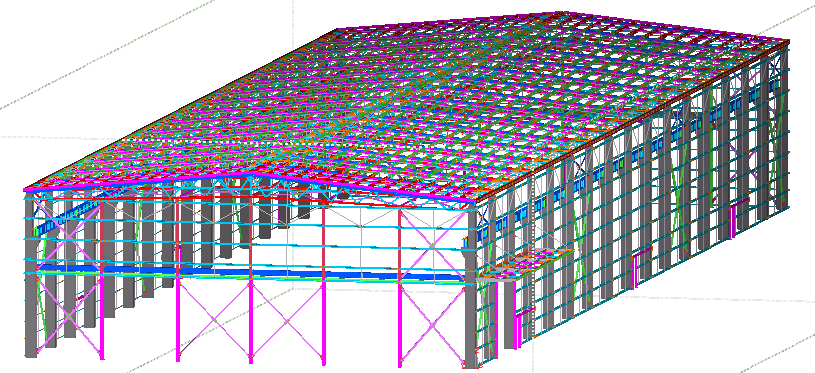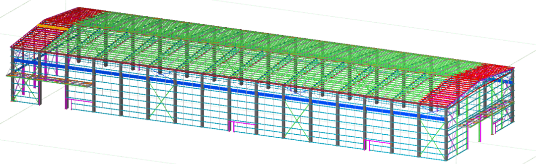 該項(xiàng)目為桁架式輕鋼屋面廠房結(jié)構(gòu),總長(zhǎng)104米,寬33.2米,檐口高度12米,主體采用平面矩形管桁架結(jié)構(gòu),并在桁架上下弦設(shè)置屋面支撐。項(xiàng)目涵蓋鋼屋架、檁條、抗風(fēng)柱、吊車梁及雨棚等部分的設(shè)計(jì)與加工制作,總用鋼量約170噸。項(xiàng)目設(shè)計(jì)充分考慮當(dāng)?shù)厥褂眯枨?,縱向布置兩臺(tái)10噸吊車,西側(cè)山墻面另設(shè)5噸吊車,結(jié)構(gòu)整體坐落于已完工的混凝土柱上,兼顧實(shí)用性與安全性。