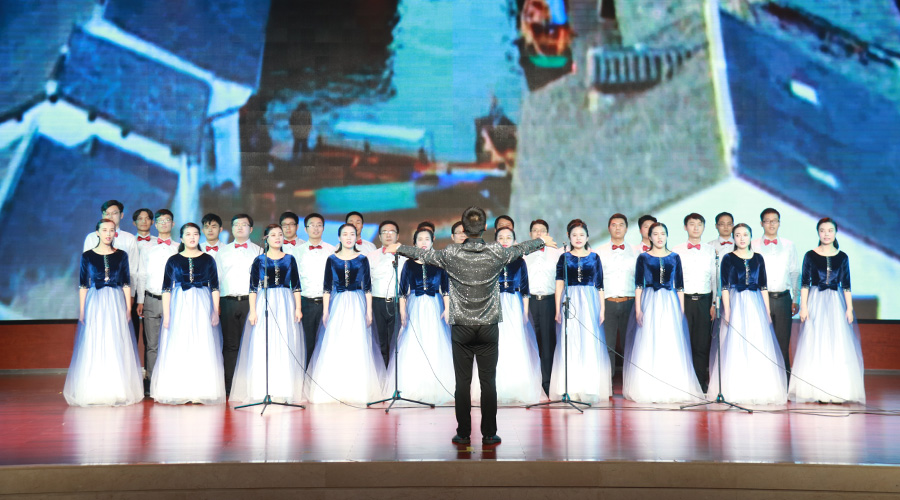 富煌鋼構董事長曹靖、富煌集團人力資源總監(jiān)肖凌云等合唱的歌曲《把根留住》 富煌門窗幕墻公司選送的詩朗誦《富煌,我的家》